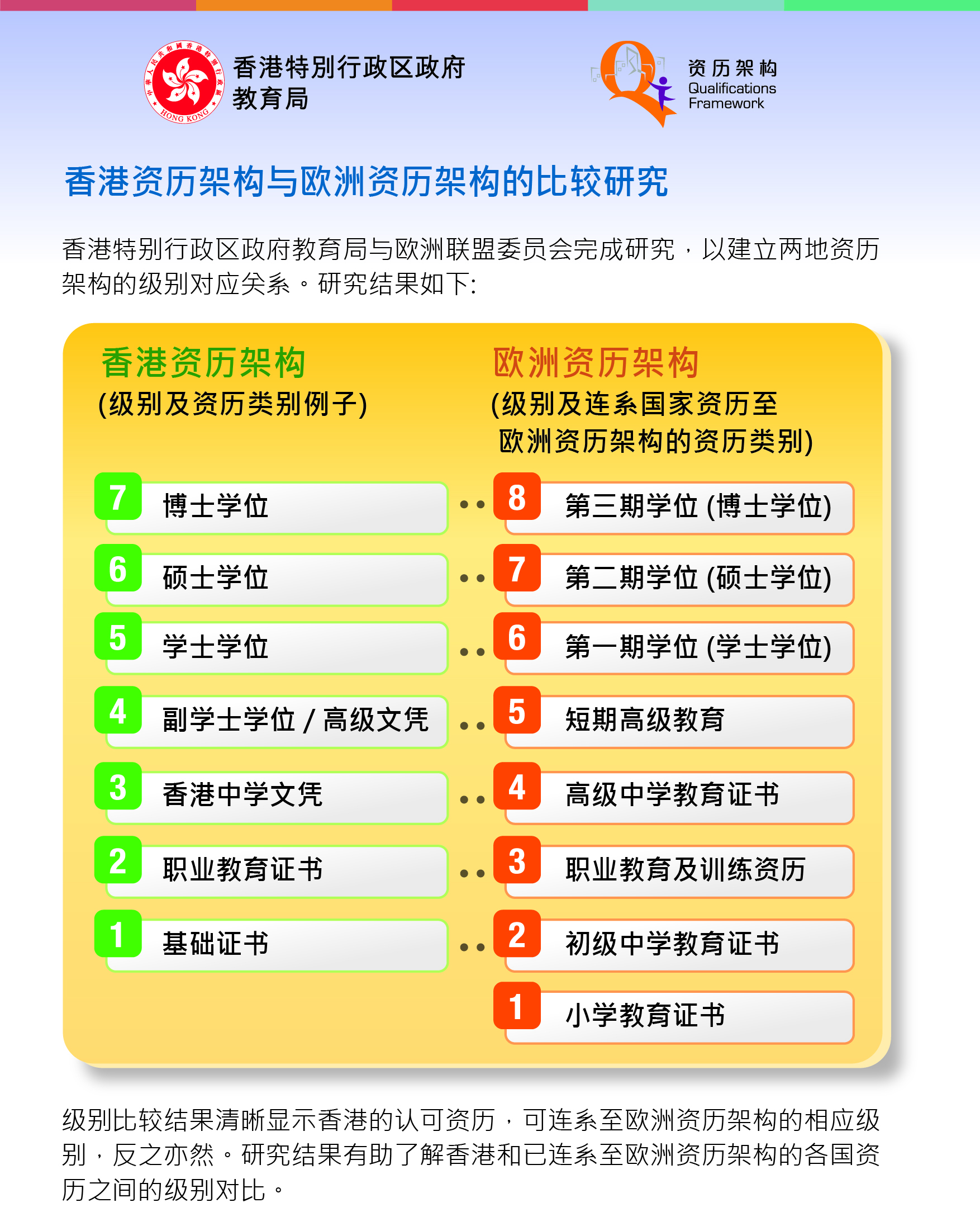 本校提供的学士及硕士学位课程分别达到香港资历架构的第五及第六级别。根据香港教育局进行的资历架构比较研究,本地大学颁授的学士及硕士学位资历,皆与欧洲资历架构下的学士及硕士学位资历相当。