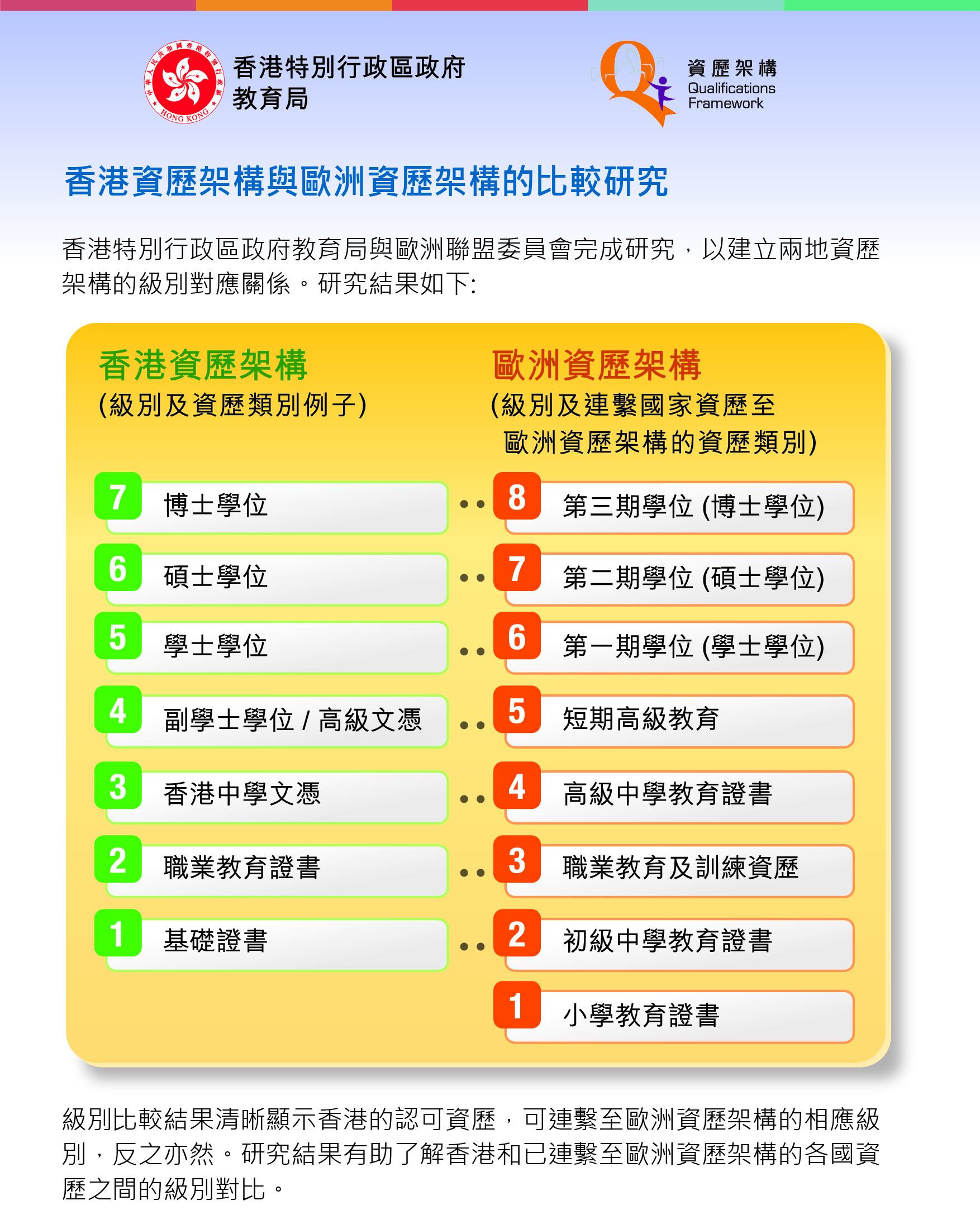 本校提供的學士及碩士學位課程分別達到香港資歷架構的第五及第六級別。根據香港教育局進行的資歷架構比較研究,本地大學頒授的學士及碩士學位資歷,皆與歐洲資歷架構下的學士及碩士學位資歷相當。