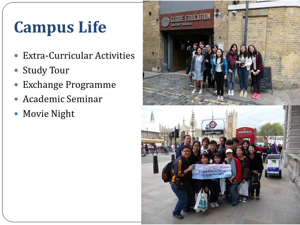 The full-time programme“Bachelor of Arts with Honours in English Language and Culture”is designed to provide students with a broad understanding of the English language through a variety of courses in literary works, linguistics and multimedia texts. As a language cannot be adequately mastered in isolation from the study of the cultural environment in which it developed, this programme also intends to equip students with a solid understanding of the expansion of western culture in the context of globalization.